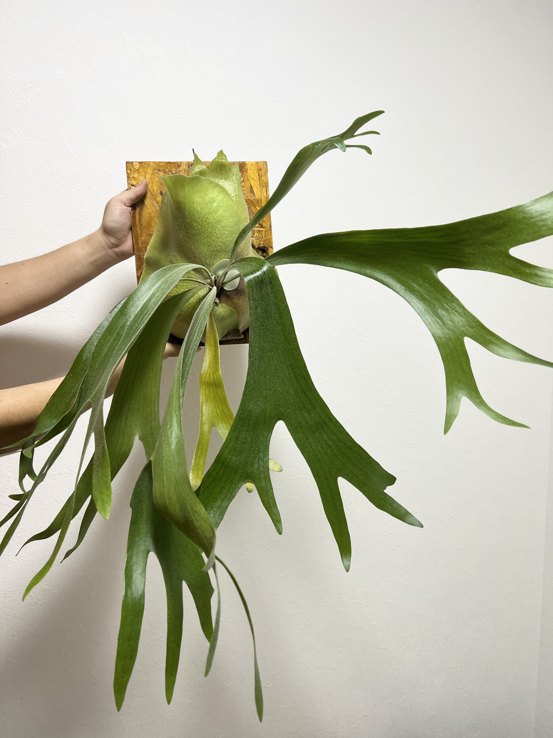 波打つような形状の垂れ下がる胞子葉と基部を覆う丸みのある貯水葉が特徴のビカクシダ